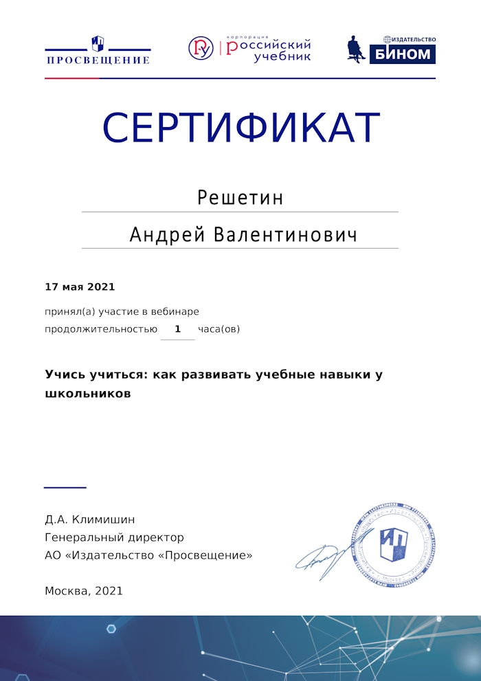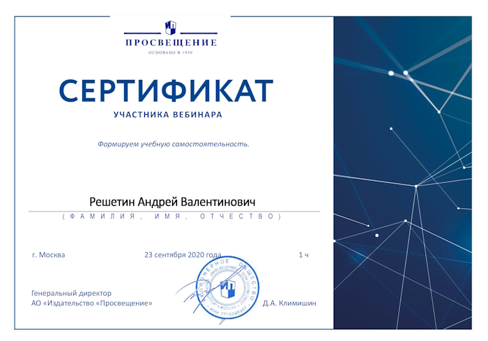 23 сентября 2020 года принял участие в вебинаре издательства "Просвещения" по теме "Формируем учебную самостоятельность" Посмотреть сертификат.