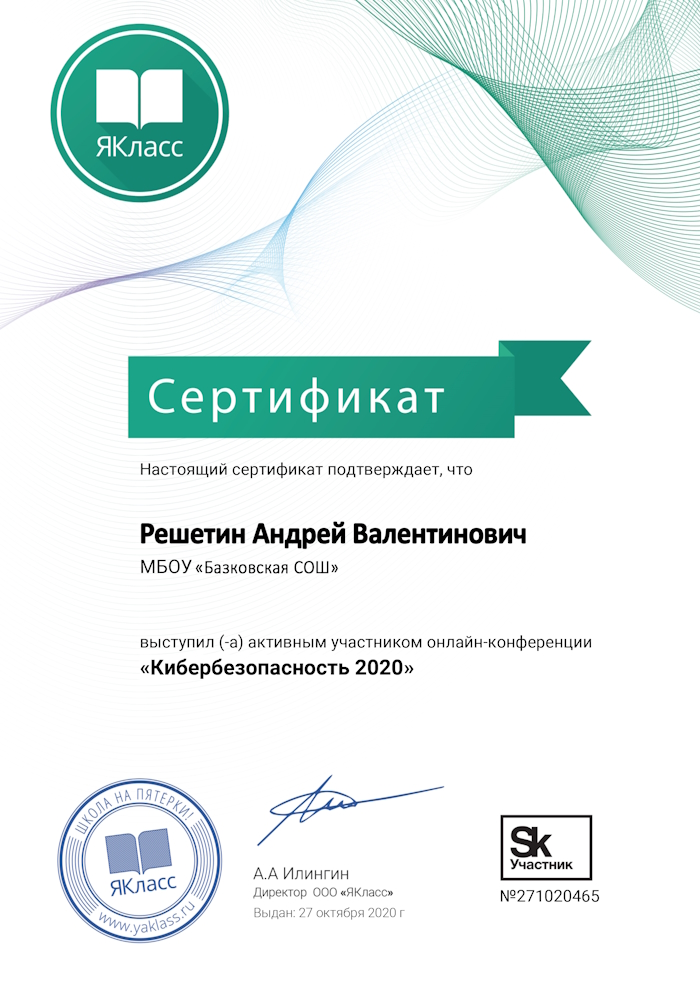 13 ноября 2019 года принял участие в вебинаре "Кибербезопасность: правила для ученика и учителя" корпорации Русский учебник. Посмотреть сертификат