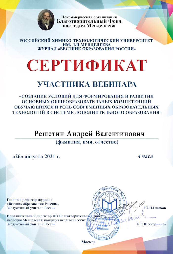 26 августа 2021 года принял участие в вебинаре НО Благотворительный фонд наследия Менделеева по теме: "Создание условий для формирования и развития основных общеобразовательных компетенций обучающихся и роль современных образовательных технологий в системе дополнительного образования" Посмотреть сертификат.