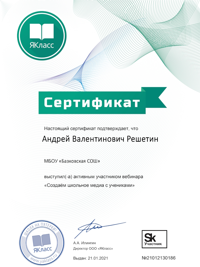 21 января 2021 года принял участие в вебинаре ООО "ЯКласс" по теме "Создаем школьное медиа с учениками" Посмотреть сертификат.