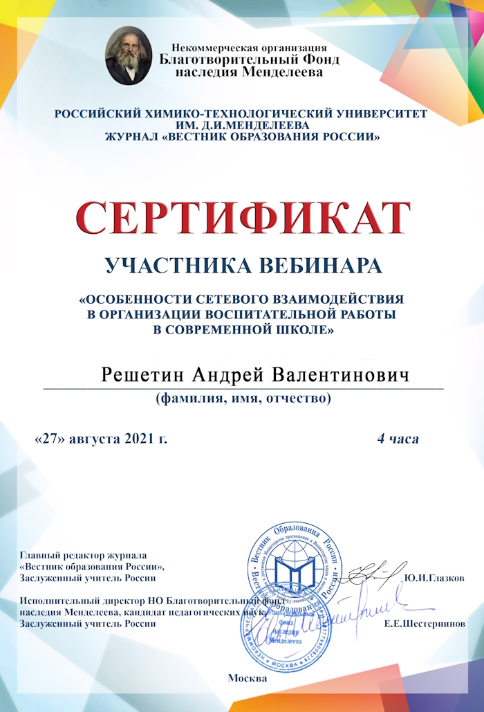 27 августа 2021 года принял участие в вебинаре НО Благотворительный фонд наследия Менделеева по теме: "Особенности сетевого взаимодействия в организации воспитательной работы в современной школе" Посмотреть сертификат.