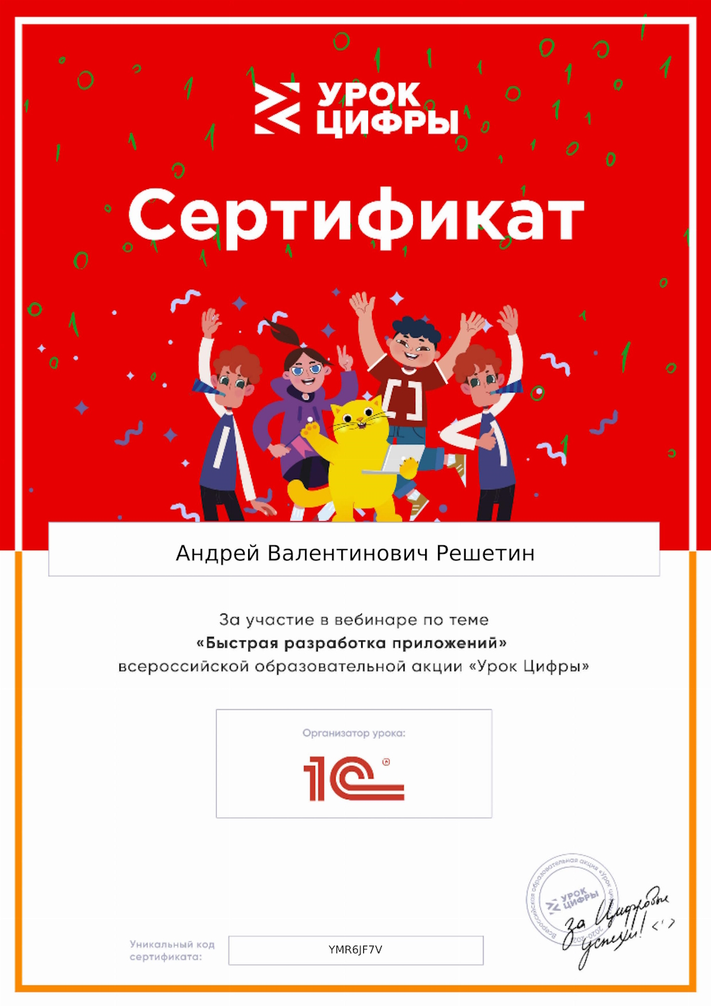 05 апреля 2022 года принял участие в вебинаре по теме "Быстрая разработка приложений" всероссийской акции образовательной акции "Урок Цифры" Посмотреть сертификат.