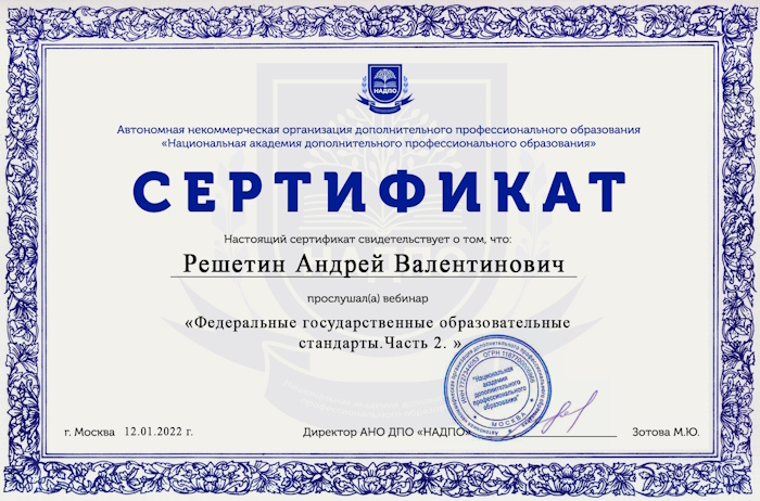 12 января 2022 года принял участие в вебинаре АНО ДПО "НАДПО" по теме "ФГОС Часть 2" Посмотреть сертификат..