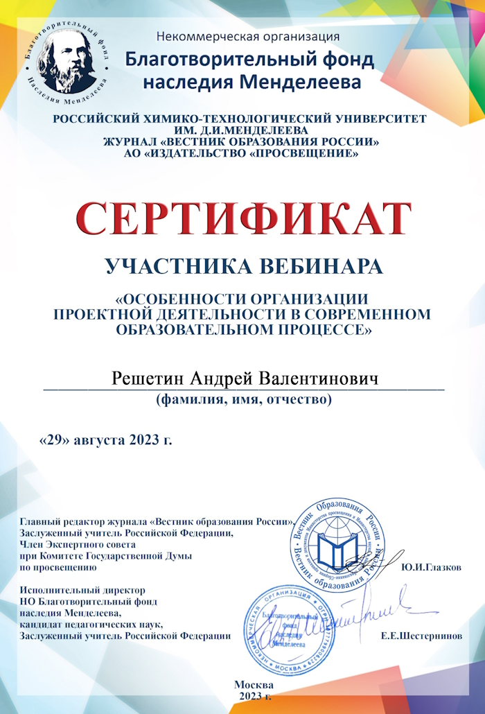 29 августа 2023 года принял участие в вебинаре НО Благотворительный фонд наследия Менделеева по теме: "Особенности организации проектной деятельности в современном образовательном процессе" Посмотреть сертификат.