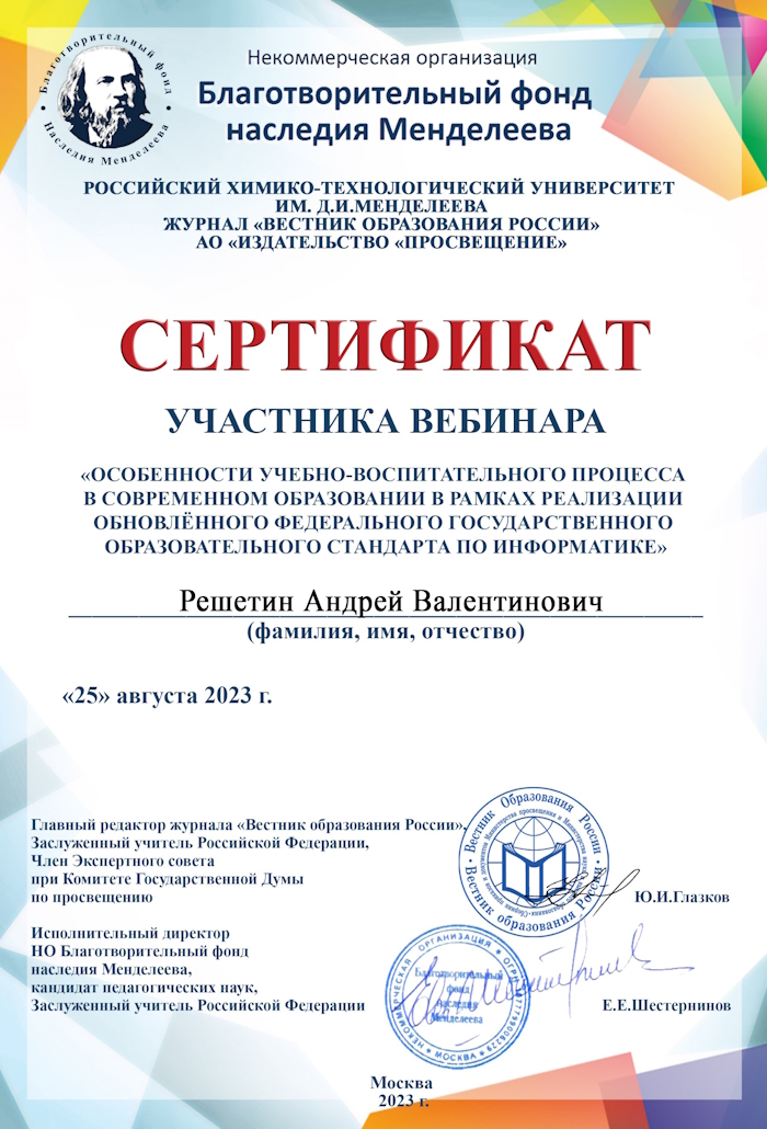 25 августа 2023 года принял участие в вебинаре НО Благотворительный фонд наследия Менделеева по теме: "Особенности учебно-воспитательного процесса в современном образовании в рамках реализации обновленных ФГОС по информатике" Посмотреть сертификат.