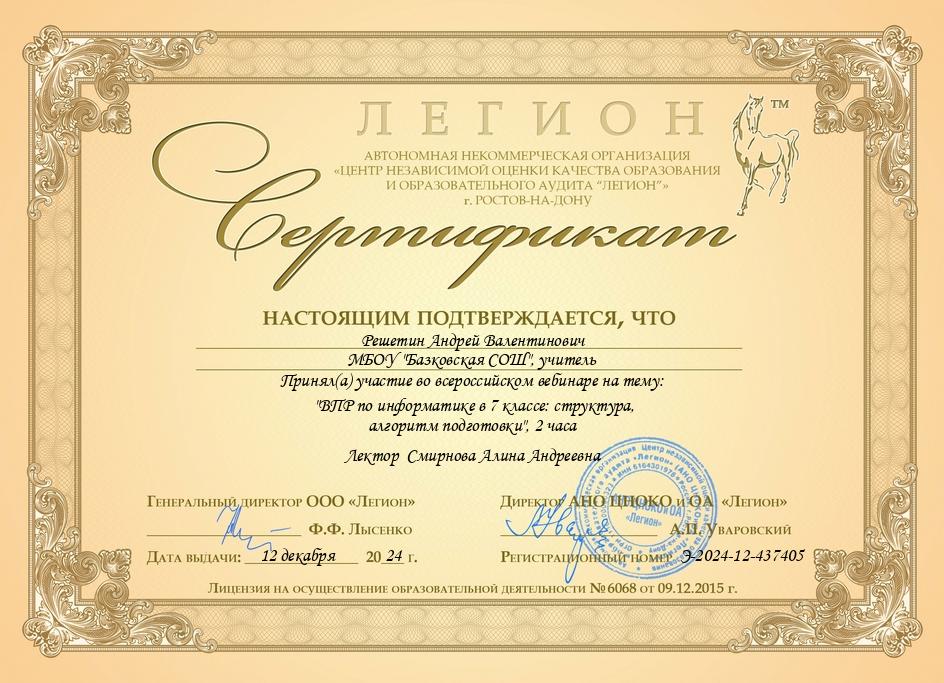 12 декабря 2024 года принял участие в вебинаре издательства "Легион" по теме: "ВПР по информатике в 7 классе". Посмотреть сертификат.